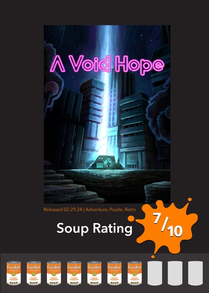This is a good game, which is let down by a lack of replay value, lackluster puzzles and dramatic finesse. A Void Hope is out on Nintendo Switch, via the eshop, and PC, via Steam.
