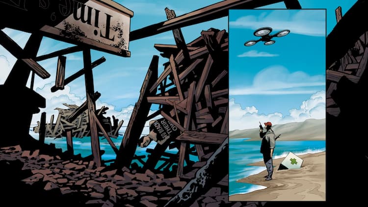 POLIS is the double-sized, 48-page debut issue that spins the tale of Natalie, a Florida teen at a crossroads in her life. She faces one of the most important decisions in her life - to remain in the home she's known for her life, ravaged by the effects of climate change as it were, or to strike out in search of the floating city of Miragua. This safe haven is populated by refugees and is the sole beacon of hope for the people beset by disaster and civil conflict.