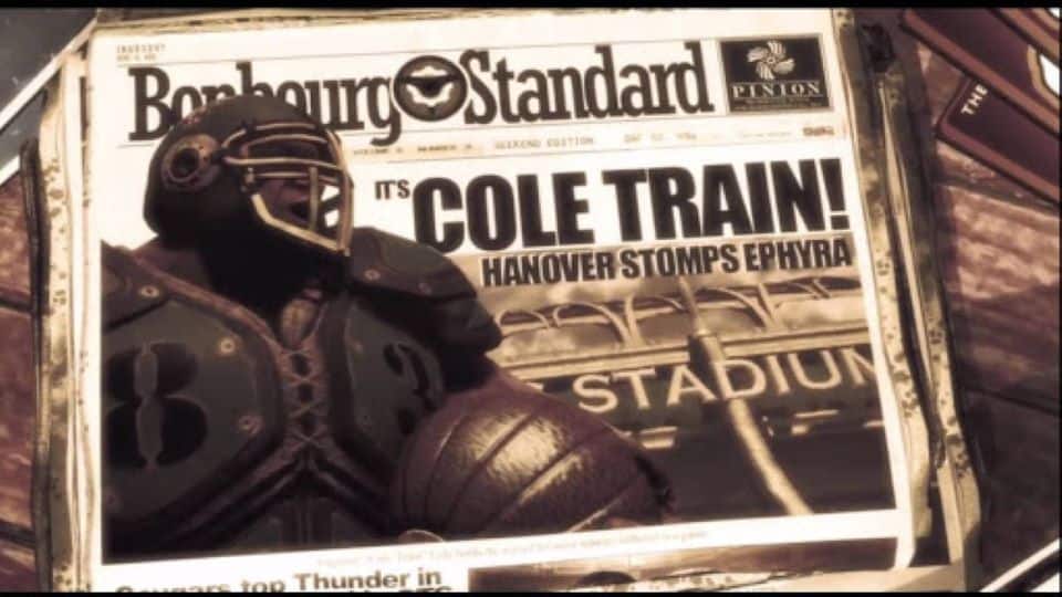 Early into the Gears 3’s campaign, you play as Augustus Cole with his squad returning to Cole's hometown of Hanover in search of supplies. One of the areas you come across is Hanover stadium, which is home to the Cougars where Cole was a major Thrashball star (similar to football). It's here where you stumble into Cole's old locker room. As he approaches his abandoned locker and opens it, he starts to have flashbacks of the days where he is gearing up for a big game. His teammates and coaches hype him up as he’s walking out to a stadium of fans chanting his name. It's a powerful scene where we get to see the man behind the armor and the life he was forced to leave behind to fight for survival in a war nobody saw coming.