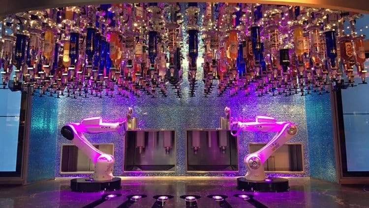 Guests go belly up to the tablets and can create their own concoctions without the risk of human shame. There are some non-alcoholic options as well, but either way, these drinks are going to be pricey. Signature drinks start around $17, and customizable cocktails go up from there. Vegas pricing is never fun, but at least the drinks are. The robot will dispense alcohol and mixers from stalactite-esque bottles hung above the bar. Then, with all the ingredients intact, the robot goes through the motions of mixing, whether that's shaken or stirred. This is fantastic for introverts uninterested in small talk but still intrigued by flair bartending.