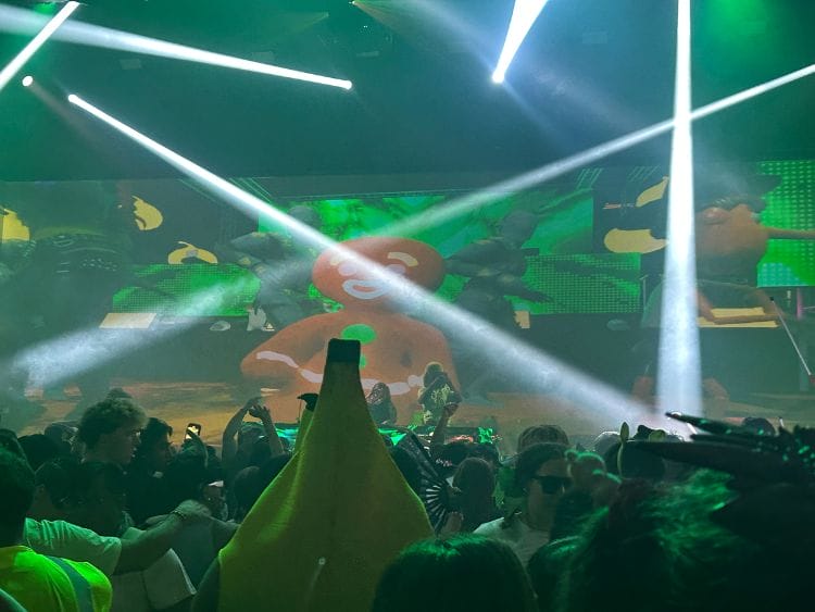 Shrek Rave made excellent use of the 360° immersive projections with animations of the iconic Shrek characters partying. On top of the wall-to-wall visuals, the light show was perfectly paired with the flow of music. The visual choreography of curated characters and shifting spotlights was enough to transport ravers Far Far Away to a dreamworld of dance. Dancing next to a Shrek cosplayer and looking up to see a visual of actual Shrek dancing alongside everyone created a captivating sense of community.