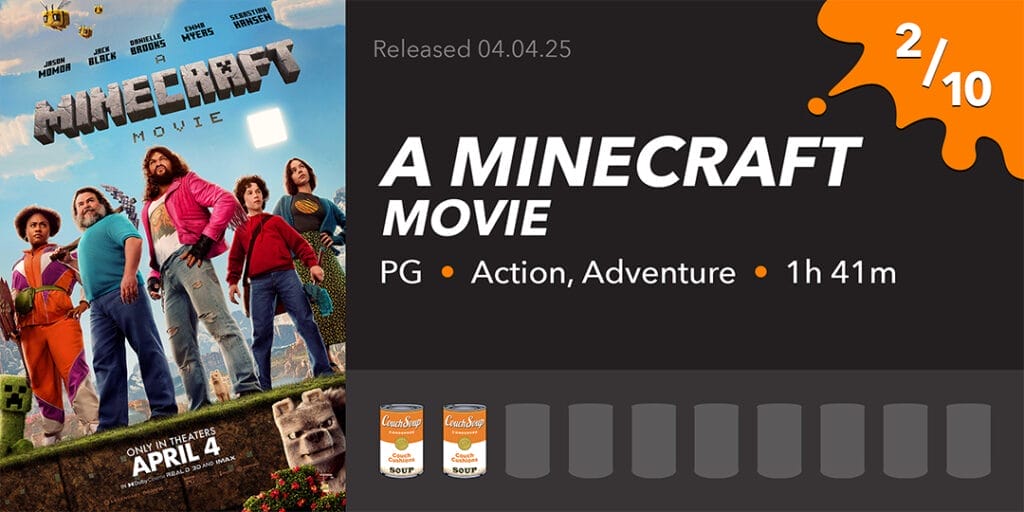 A Minecraft Movie is the worst film I’ve seen since Madame Web. The plot is nonsensical at best, and the characters are one-note with little to no development. The one with any semblance of a backstory is quickly pushed to the side in favour of Jack Black, saying, “First we mine, then we craft. Let’s Minecraft.” The film at least looks decent, and I’m sure kids will have fun with it, but they deserve better. We deserve better. Don’t bother with this film unless you have a kid who loves Minecraft or you want to rot your brain.