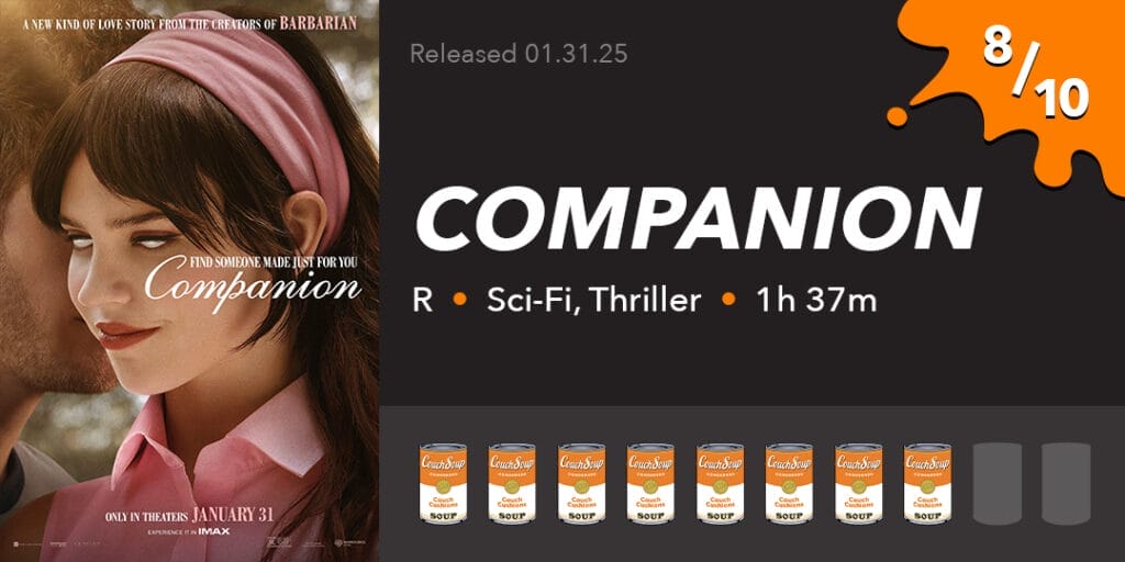 Companion was a surprise, to be sure, but a welcome one. I ended up really enjoying the story, characters, and the overall vibe of the film. Sure, I had some issues with pacing and would’ve loved some extra time to get to know these characters better, but the film still works well. It’s a fun time, and it was well worth the price of admission.