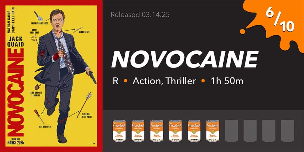 Novocaine is an average action flick with outstanding visual effects. The story, minus a pretty good twist, was formulaic and nothing you haven’t seen before. Nathan Caine was an interesting character, but the rest didn’t reach their full potential. The practical effects elevate all of this,  but there’s only so much they can do. If you just want to see Jack Quaid get horrifically injured, this film is for you. Just don’t go into it looking for a deep story.