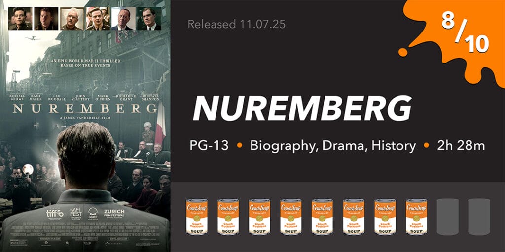 I wouldn’t say I had fun watching Nuremberg, but I’m glad I saw it. It’s an important story to tell, especially today with everything going on. The performances are excellent across the board, and for the most part, the film looks fantastic. Some issues with the story's presentation and scene continuity prevent this from being one of my favourites of 2025, but it may be one of the more important WWII films released in recent years.