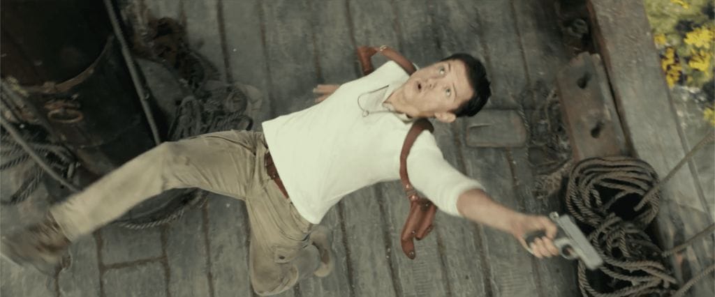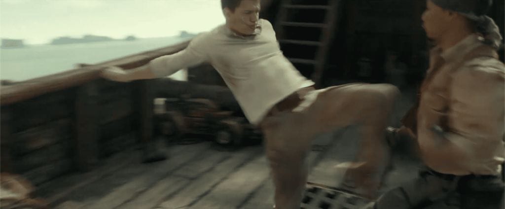This is the first glimpse we see of Nathan Drake taking out a bad guy. While he's holding a gun we don't see him fire it at a bad guy in either the teaser trailer or this one. The flying knee is a solid move and no doubt this guy is not getting back up again. But it's a bit worrisome that we haven't seen any action featuring guns, rockets, or grenades when it's such a big part of the gameplay in the Uncharted games. Does Drake kill hundreds of bad guys like in the games to gain fortune and glory or is this a PG-13 Spider-Man version of Drake that doesn't kill? Even Indiana Jones had to shoot loads of Nazi's to win the day. Let's hope this Uncharted is not too watered down.