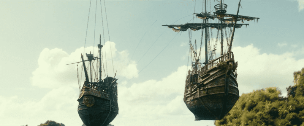 This is where things get interesting. An old Carrack class ship rising out of the water. I'm not seeing any floats or wires attached to the boat. So unless this is channeling some supernatural Pirates of the Caribbean ghost ship themes this is a bit of a mystery on how this ship is doing this. If you have theories post them in the comments. The next shot we even see the tattered sail unfurl but by who...possible flashback?