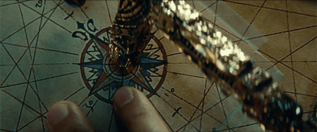 Puzzle-solving time. There is a lot of footage out of order here and it's pretty obvious. This is clearly later in the film after they've stolen the cross and found the map that gives them the clear where the treasure is buried. Nice shot though.