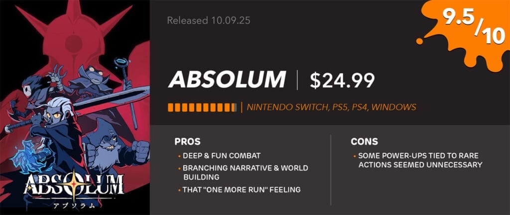 Absolum is out on October 9th on PC, Nintendo Switch and PlayStation 4 and 5 for around $25. My recommendation is to go and get it. I don’t think you’ll be disappointed.