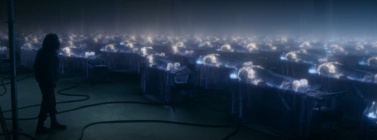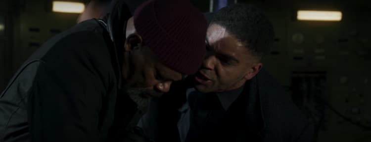 Back in New Skrullos, G’iah shuts down the human storage facility, and the imprisoned awaken. Everett Ross (Martin Freeman), the UK Prime Minister, and others we’ve seen across the season shake off their grogginess. Rhodey, dressed in a hospital gown, wakes up from his slumber and almost collapses. Could he have been here since the end of Captain America: Civil War when he was injured by Vision?? That’s a massive revelation!