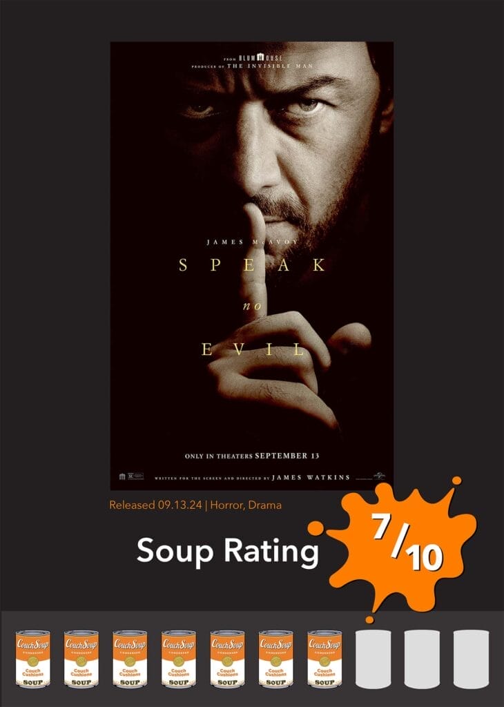 I’m not the biggest horror/thriller film fan. I get scared easily, abhor jump scares, and I most certainly detest the feeling of unease that most horror/thriller films instill in the audience. So why am I reviewing the new James Watkins thriller Speak No Evil (a remake of the 2022 Danish film)? Well, it’s for one reason: James McAvoy. After seeing him play the crazy villain in Split, I hoped to see him in a similar role again. So when I saw he was playing the villain in Speak No Evil, I put on my big boy pants and went to go see it, despite my usual avoidance of such films. Did this film surprise me and become one of my favourite James McAvoy performances to date? Or will it be just another film that will haunt my nightmares in the wee hours of the morning? Let’s find out.