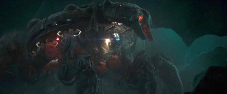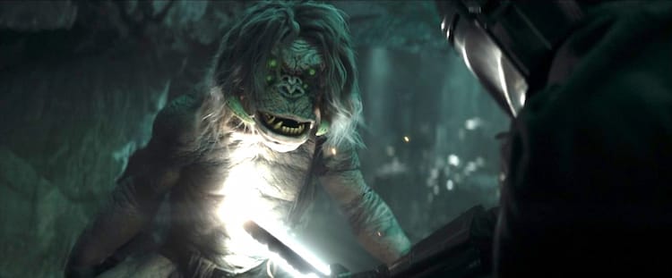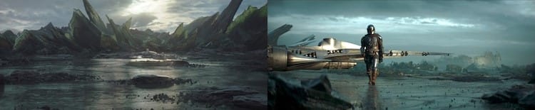 Once they stepped foot on the planet, a whole atmosphere of foreboding and mystery permeated the scenes. According to the galaxy, this planet should be void of life, but they soon find they are not alone. The deep shadows and abandoned ruins add to the air of horror elements with jump scare attacks and Din being prey to a droid monster who wants to add his armor to its collection.