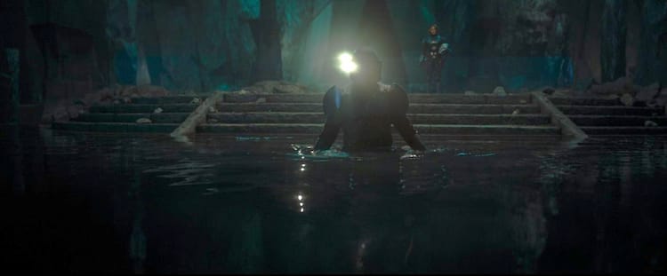 Din takes a moment of contemplation and then removes some of his accessories. As he step-by-step lowers himself into the Living Waters, he starts reciting the oath. As he reaches the end of the oath, he also reaches the end of the stairs. He disappears under the surface of the water, and Bo-Katan is quick to dive in after him. It’s a long way down. She once again rescues Din.