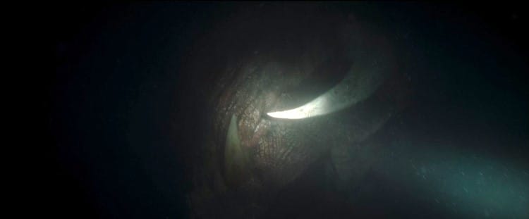 She uses her jetpack to quickly get them back to the surface. On the way up, she catches a glimpse of a massive beast: THE MYTHOSAUR! The waters are dark, but with her headlamp, she is barely able to see its outline, tusks, eyes, and skin. The creature is massive! The legend is real! It’s alive!