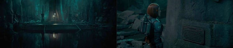 Once they stepped foot on the planet, a whole atmosphere of foreboding and mystery permeated the scenes. According to the galaxy, this planet should be void of life, but they soon find they are not alone. The deep shadows and abandoned ruins add to the air of horror elements with jump scare attacks and Din being prey to a droid monster who wants to add his armor to its collection.