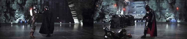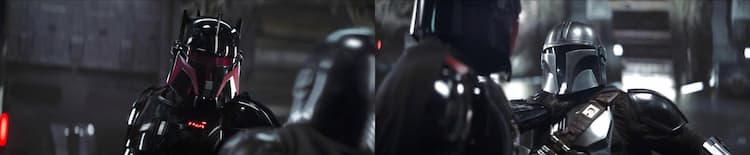 “Hand over the Darksaber, and I will give you a warrior's death,” Gideon attempts to barter with Bo-Katan. She howls with rage and engages him with a renewed vengeance. Katee Sackhoff’s performance as Bo-Katan is outstanding! After a few swings and parries, he grabs her hand holding the Darksaber and crushes it along with the Darksaber. The weapon sparks, and the blade dies, “The Darksaber is gone. You’ve lost everything. Mandalorians are weak once they lose their trinkets.” “Mandalorians are stronger together,” Bo-Katan corrects just as Din and Grogu reappear as backup, Din firing his blasters.