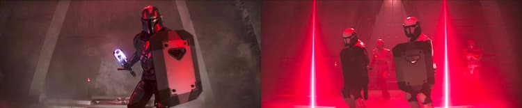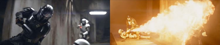 Bo-Katan and her troops descend into the hidden Imperial base and are met with Moff Gideon’s new and improved Dark Troopers taking flight with their jetpacks. The two opposing groups meet midair like two different angry hornet nests fighting for survival. The aerial battle is intense, showcasing the Mandalorians’ skills!