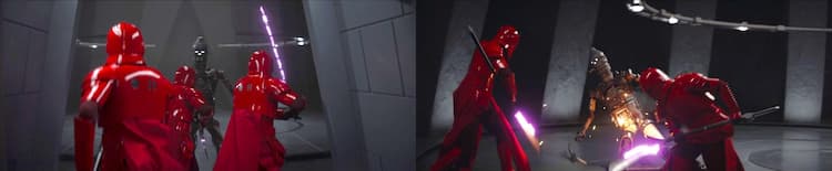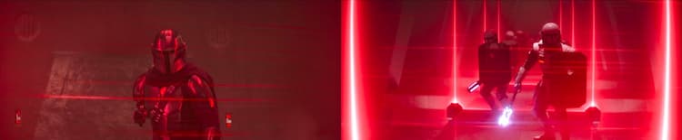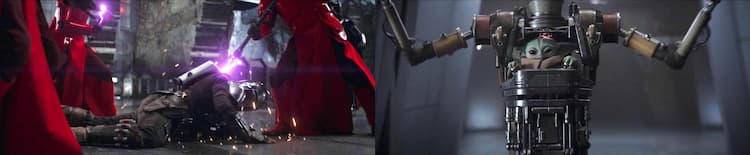 The Guards make quick work of chopping down IG-12. Grogu Force jumps up to some frames holding the lights for the room. He scurries along, Force jumping out of the way as the Guards keep trying to bat him down from above. It seems his time training with Luke Skywalker served him well.