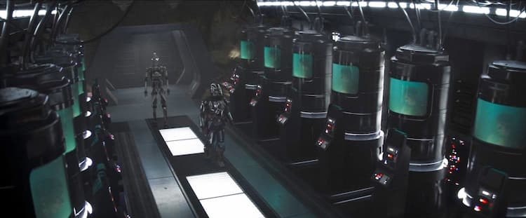 In the next room, Din and Grogu discover the reason for maximum security, Moff Gideon's prized experiments: Clones of himself designated for the elite Dark Troopers. Din immediately goes over to the control panel to destroy the experiments. He sets off the self-destruct sequence on the cloning tubes.