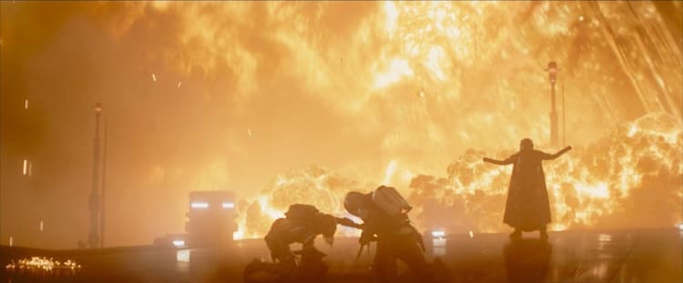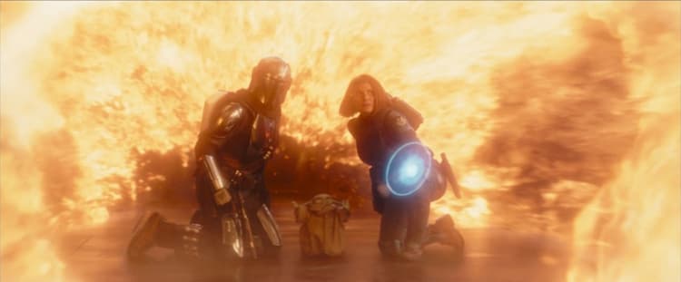 Grogu keeps Din, Bo-Katan, and himself safe by using the Force to create a shield as the torrent of flames washes over them. Bo-Katan's face is filled with wonder as this little foundling saves the day.
