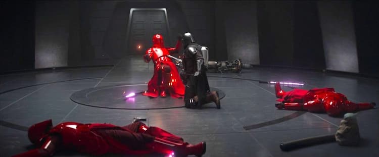 Moff Gideon and Din face off and go toe to toe. In his new beskar armor, Gideon is evenly matched with Din in combat. He’s strong. The Praetorian Guards step in to take over the fight. They encircle Din, and when it appears they are about to execute him, like they did Paz Vizsla, Grogu, in IG-12, steps out of hiding, jamming the “No,” button over and over.