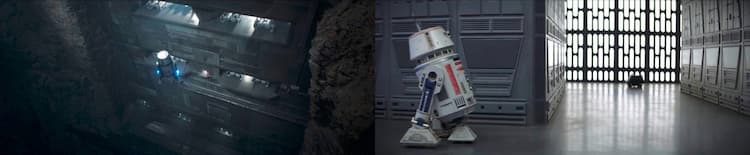 Din contacts R5 to retrieve the Moff’s command center location. The timid droid uses his side thrusters to descend into the big scary Imperial base. R5 finds an access port located on a ledge of the base overlooking a huge crevasse and utilizes it to help Din gain access to Gideon.