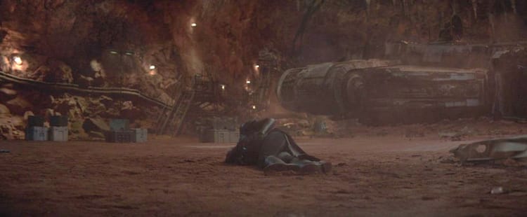 Alone, Vader angrily marches down the tunnel toward the hangar. Just as the transport lifts off, Vader reaches out a hand, and Force holds the entire shuttle preventing it from escaping. The shuttle strains against his hold, but to no avail. The engine spits and sputters, finally failing. Vader drops the ship back in its former resting place. He immediately starts brutally Force ripping apart large sections from the side of the shuttle. Impressive. Once Vader thinks he is victorious, he realizes the transport is completely empty. Another transport just behind the wrecked ship zooms out of the hangar and away to safety. He watches it go.