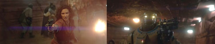 Two Imperial troop transports make their way to Jabiim’s surface while the people of ‘The Path’ quickly scramble to fortify all entrances into the hangar bay. The platoon of stormtroopers disembark their transports and hurriedly take up formation outside one of the major blast doors outside the hangar while a handful of them assemble a heavy artillery blaster gun. Reva makes a grand entrance.