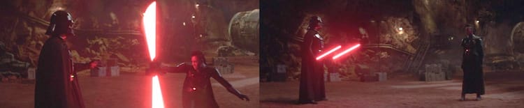 Without looking, he stops her lightsaber with the Force and slowly turns to face her, “He was wise to use you against me.” Reva screams in rage. Reva attempts to attack Vader over and over. It looks like Anakin learned some things from his old Master, after all. Without the use of his lightsaber, Vader sidesteps her attacks and uses the Force to stop or divert her attacks. This is a great display of his power.