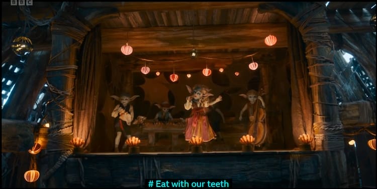 Not enough? How about a 3 minute musical dedicated to Goblins eating an orphaned baby? The King Goblin is a nightmarish Jabba the Hut-looking thing, complete with a huge slobbering tongue and a jaw as large as a hippo, literally salivating as Ruby and the Doctor scramble to intervene as the baby rolls down a conveyor belt towards certain doom in its mouth. Strangely, it reminds me of the climax of Toy Story 3, but way darker.