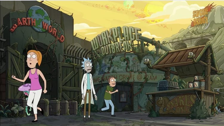 Meanwhile, at Earth World, it’s not as horrible as Rick remembered, in a bad way. Yeah, it’s commercialised (and a whole lot like Disney), but it’s not as awful as he wanted. Morty, a human in Earth World, is instantly picked up by an alien girl who only likes him because he’s human. There are also these weird celebrity caricature mascots with massive heads everywhere, like John Legend and Ruth Bader-Ginsburg. Disguising themselves as these mascots, Rick, Summer and Jerry go deeeep into the staff-only basement.