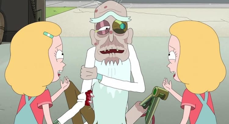 Rick returns to Earth and saves Gene but is one-upped by his daughters, who age him up to over 300 years old! He’s so proud of his girls; they cry together and embrace. Finally, they reset their ages just as the rest of the family returns home in pain, Summer and Jerry still with huge heads.