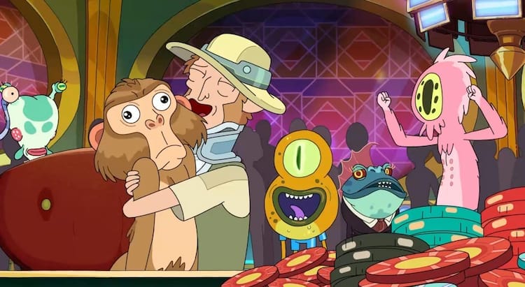 Turns out, the people they’ve been impersonating stole the money and Hypercoal and are living it up on a space yacht. A Death Race sequence ensues with a bunch of folk crashing and exploding everywhere. One lucky racer who didn’t die was the owner of a monkey that had been killed by the thieves (more on him later). After killing a bunch of people, Rick makes it to the yacht and takes down the thieves, but Morty jettisons the cargo into space so nobody can have it. Hasn’t there been enough death already because of this money?