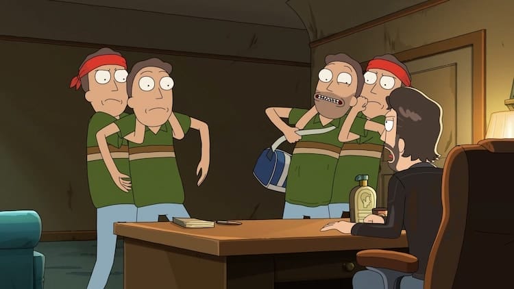 Jerry Smith is sporting a 5 o’clock shadow and eating cereal in his kitchen while the usual hijinks are happening. Summer and Morty are arguing, and Beth is heading out to work, all ignoring Jerry, as to be expected. But then OUR Jerry walks in and rumbles 5 o’clock shadow Jerry, who takes off running. Surprisingly, clean-shaven Jerry catches him, tackles him to the ground, and, after a brief clone accusation, they head to the mall to talk it out.