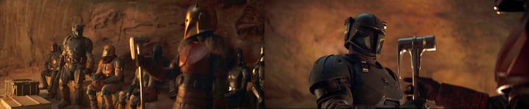 When Bo-Katan and the Armorer join the others, Bo-Katan does not wear her helmet. The Tribe’s body language is collectively wondering why and some of them seem betrayed. The Armorer explains, “Bo-Katan walks both worlds. And she can bring all tribes together. It is time to retake Mandalore.”