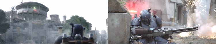 The planetside strike team of Mandalorians gets a tip of an ambush from a Kowakian monkey-lizard. The Mandalorians dig into cover as they fend off the attacking pirates. Things don’t look great for the Mandalorians, but Paz shows up, and his heavy blaster cannon helps with turning the tides for a short time. The pirates regain the advantage with a heavy cannon. The Mandalorians are forced to dig in and keep trying to take back the High Magistrate’s office.