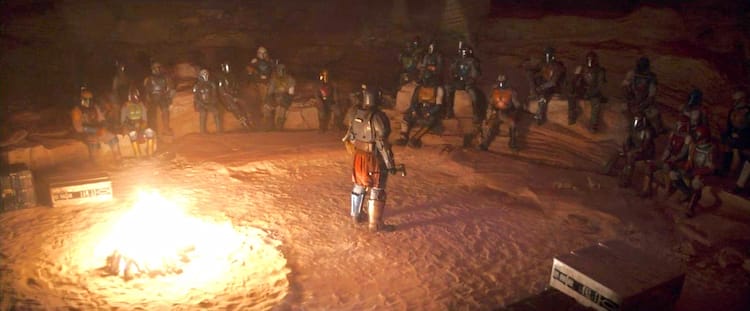 Din Djarin calls a meeting of the Mandalorians. While holding the Armorer’s hammer, he gives a speech in which he petitions the Mandalorians to help Greef Karga, “He’s had a change of heart and has risked his life to save mine as well as the foundling in my charge.” Din goes on to explain Greef has offered him a tract of land on his independent world, “Perhaps it is time for us to live in the light once again on a planet we are welcome so our culture may flourish and our children can feel what it is to play in the sunlight.”