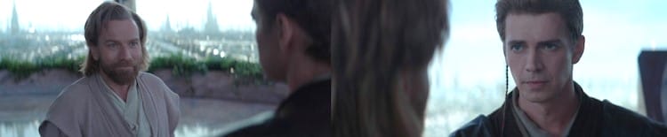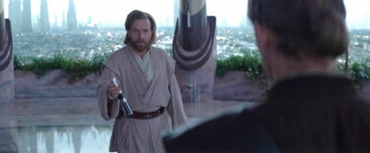 The training duel flashback sheds some light on how Obi-Wan outmaneuvered Anakin. Even though Anakin had knocked Obi-Wan’s lightsaber from his hand, rendering the Jedi Master weaponless, he still chooses to fight, seemingly unarmed. Obi-Wan avoids the lightsaber and lands a well-placed elbow, spinning around Anakin in an unanticipated move. Anakin, stunned, loosens the grip on his own weapon. Obi-Wan Force pulls the lightsaber from his Apprentice’s hand, “You’re a great warrior, Anakin, but your need to prove yourself is your undoing. Until you overcome it, a Padawan you will still be.” Obi-Wan hands Anakin back his lightsaber with a friendly smile.