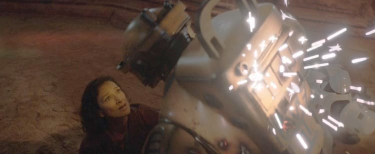 Reva notices something glinting in the dirt not far from where she lay: Obi-Wan’s holoprojector. “Kenobi, are you listening to me?” Roken asks. Obi-Wan has a serious far away look on his face, “Something’s wrong.” Reva activates Bail Organa’s message to Obi-Wan. Remember that super duper incriminating message with all the details regarding the ‘children,’ ‘the boy,’ Owen and Tatooine? The message that was the perfect example of what not to do for covert operations? Well, Reva finds it. I’m going to need C-3PO to tell me the odds on this one.