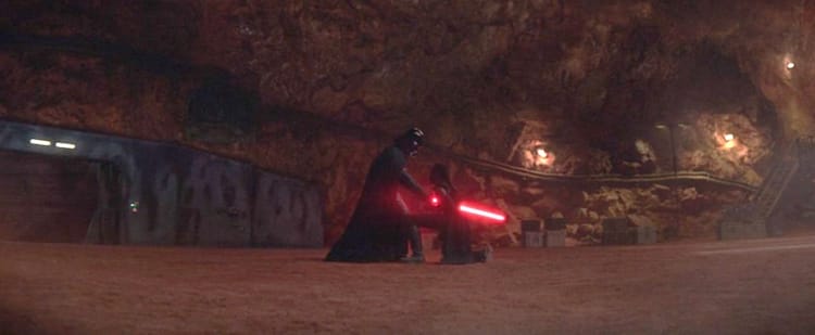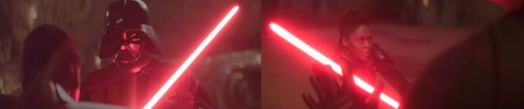 Vader stands in silent rage. Reva slowly approaches Vader’s back, ignites her lightsaber, and takes a swing at Vader. She took a long time approaching Vader, slowly creeping up on him and choosing to attack after he was no longer focused on his prey. She missed her window of opportunity.