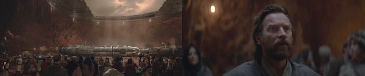 Reva and Obi-Wan approach the blast door on opposite sides, each backed by the respective parties. Obi-Wan places his hand on the door and deeply concentrates on the Force. “If this is you stalling for time, it won’t work,” Reva interrupts, “Lord Vader will have you at any cost.”