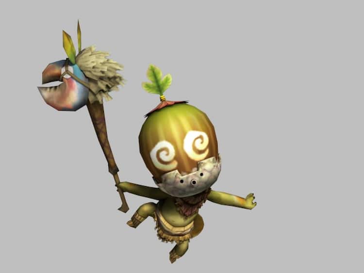 Cha-Cha, a lost child from the Shakalaka tribe within the Deserted Island, made his debut in Monster Hunter Tri. Aiding the player character in their quests, Cha-Cha brings the twee factor to hunting gigantic fiends throughout the game. Usually sporting an acorn mask and a staff donning a cute little monster head on top, Cha-Cha is the perfect amuse-bouche for the stressful hunts.