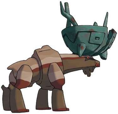 Bulbapedia: “Ting-Lu is a Pokémon resembling a cloven-hoofed mammal such as a deer or moose. Its body is composed of layered rock, ranging in color from dark brown to a light tan. Its head has several red markings, as well as small red eyes and what appears to be a dewlap on its chin. Upon its head is a large cracked vessel with several antler-like spikes jutting out from the rim.