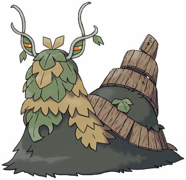 Bulbapedia: “Wo-Chien is a snail-like Pokémon composed of a dark-green mossy form covered in green and yellow leaves with curling vines forming its eyes. A long wooden tablet curled around its backside forms its shell.