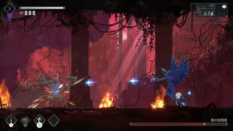 ENDER MAGNOLIA is a classic Metroidvania. You work your way through the world, fighting enemies, exploring hidden rooms, and finding treasures to level up and learn new skills. That formula isn’t extremely innovative, but this progression offers very little friction (in a good way). Double jump and dash are handed out in the first few hours, so it becomes quickly satisfying to traverse the screens. Fast travel is also unlocked very early, which is a Godsend!