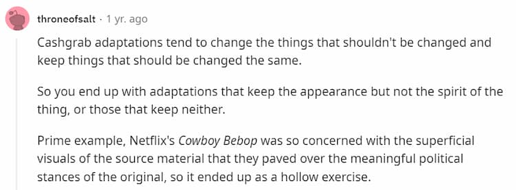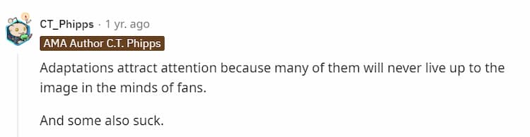 To further exacerbate the point, I’d like to invite you to view other opinions on why book adaptations fail. On this Reddit thread named “Why are Adaptations so Controversial?,” C.T_Phipps said it eloquently: