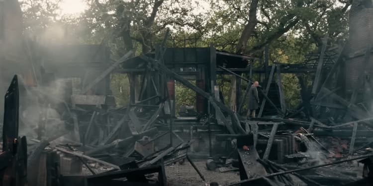 Back in the past, Claire and Jamie go through the ashes of their home. Sitting on what’s left of the porch, Jamie asks Claire why she never says no when called to the aid of a dying man, even if the case is hopeless–a metaphor for their home, now reduced to charred rubble. Claire explains she can’t admit there’s anything to do but go on. Jamie agrees with her, and Ian recovers William’s picture, letting on that he knows William is Jamie’s son and promising not to tell anyone. They also haven’t found Claire’s cat Adso. Hopefully, the poor baby will turn up later.
