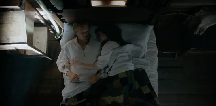 Jamie then shares his second reason for going. He promised himself he’d never face his son across the barrel of a gun, and William is a redcoat, so maybe it’s time to get out of dodge. Later that night, he prays, asking God for wisdom. Claire overhears but keeps silent for now. They’ve moved into the original house they first built on the Ridge, and while lying in bed, Jamie tells Claire he dreamt of Bree and Roger at Fiona's house. He then describes a telephone that Jem picked up, saying he wanted to speak with his grandad. Also, a lot of time has passed! Claire’s hair is long again? I almost missed that detail.